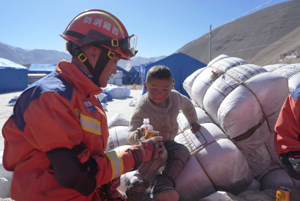 ??2025年1月8日,在西藏定日县措果乡塘仁村安置点,消防救援人员和小朋友互动。1月7日,西藏日喀则市定日县发生6.8级地震。新华社记者 晋美多吉 摄