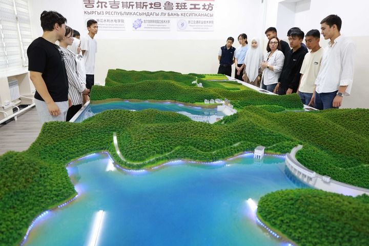 ??2025年6月4日,在吉尔吉斯斯坦首都比什凯克,师生在吉尔吉斯斯坦鲁班工坊水利枢纽工程模拟演示实验室学习水电站知识。新华社发(罗曼摄)