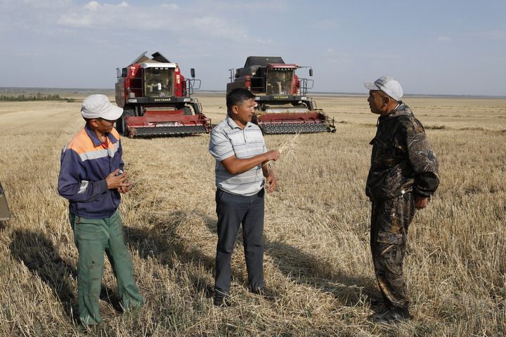 ??2022年9月2日,在哈萨克斯坦北哈萨克斯坦州,与爱菊集团合作的农场主在收割。新华社发(奥斯帕诺夫摄)