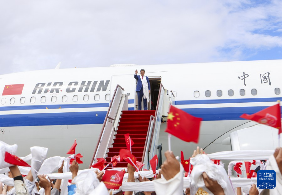 习近平离开西藏时,各族群众纷纷来到拉萨市区的沿途道路两旁,挥舞红旗、手捧哈达,欢呼着向总书记问好,向总书记表达由衷的爱戴。拉萨贡嘎机场,身着节日盛装的干部群众挥舞着红旗和花束,载歌载舞,高喊“扎西德勒”,表达高原儿女对以习近平同志为核心的党中央的感激之情、对建设社会主义现代化新西藏的坚定信心。