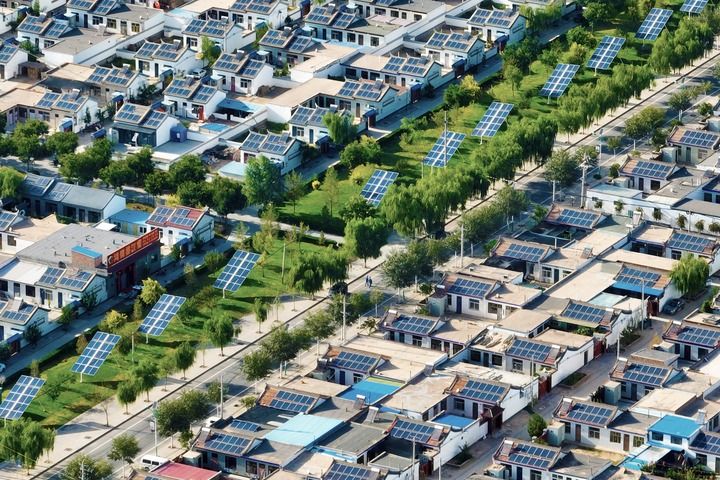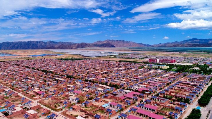 ??如今的闽宁镇,加速拥抱新质生产力,又有了新名片——“绿电小镇”,一块块蓝色光伏板整齐排列在空地、屋顶。(国网宁夏电力有限公司供图)