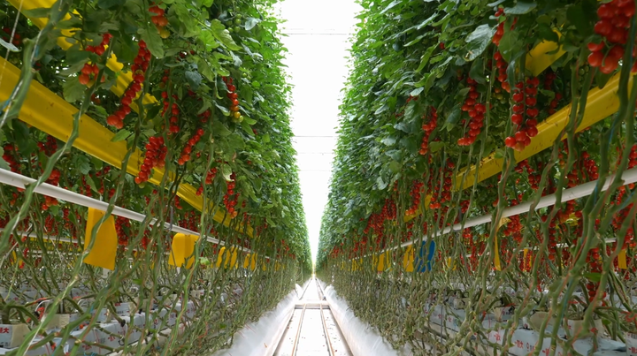 ??凯盛(银川)现代智慧农业科技有限公司,在闽宁镇打造的智慧农业产业园玻璃温室里,种植番茄。(永宁县委宣传部供图)