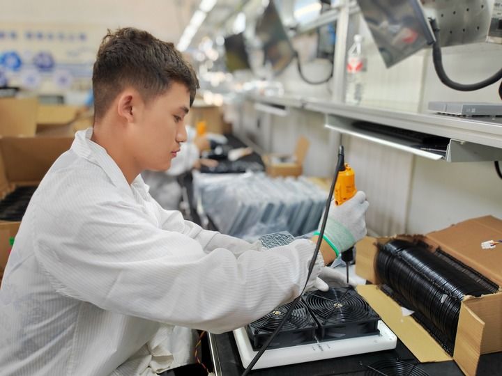 ??2025年5月16日,闽宁镇闽宁产业园,星汉智能科技(宁夏)有限公司的工人正在生产线上组装产品。新华每日电讯记者任玮 摄